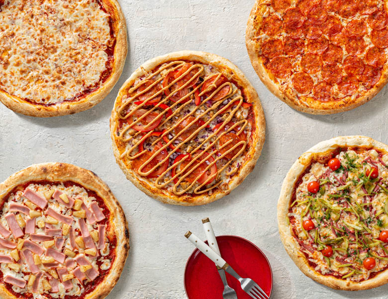 Пепперони (с салями, 30 см), Фьюжн (с курицей, 30 см), Римская (с колбасой полукопченой, 30 см), Маргарита (30 см), Гавайская (с ветчиной, 30 см)