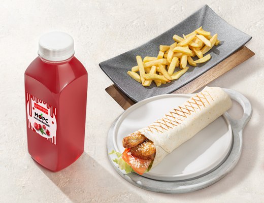 Фреш-ролл с цыпленком (сочная котлета из куриного бедра, салат Айсберг, помидоры, соус Цезарь, сыр Пармезан), картофель фри, клюквенный морс (500 мл).