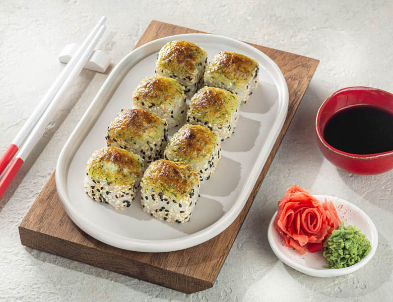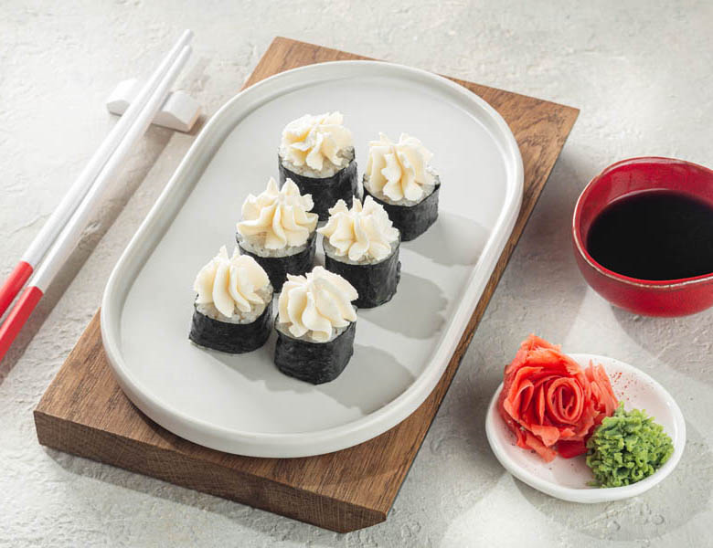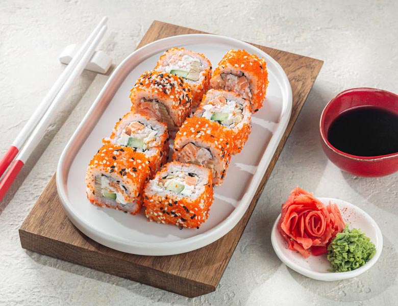 Водоросли нори, рис, темпура, краб-крем, авокадо, икра летучей рыбы, лук зеленый